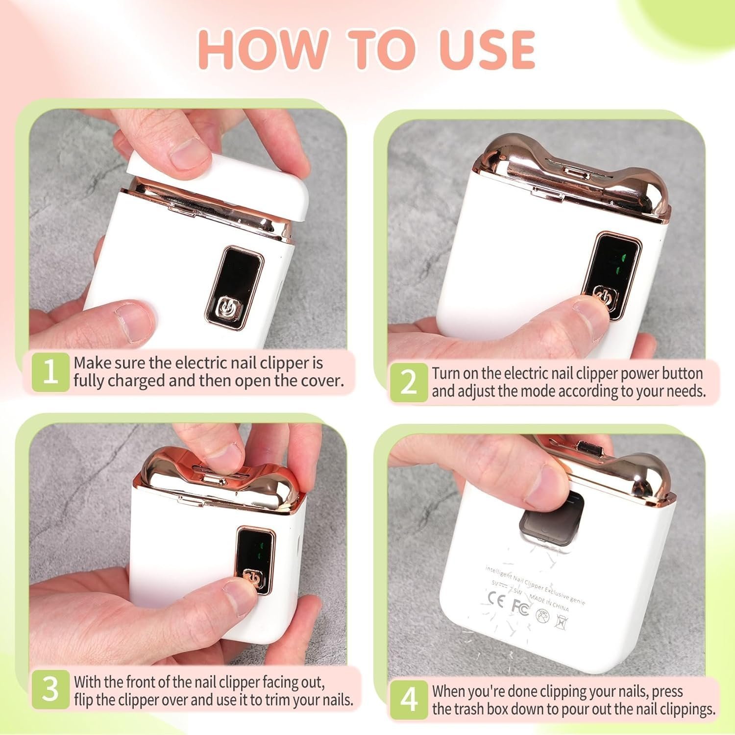 - Safety First Design Principle: Safety is at the core of our product design philosophy. This Nail Clipper is specifically designed for fingernails, ensuring that it can be used safely and effectively without the risk of injury. It is important to note that the product should not be used on other body parts to maintain hygiene and safety standards. Additionally, the device should be kept out of reach of small children and pets to prevent unintended use or injury.